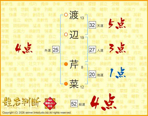 渡(13画)辺(19画) 芹(8画)菜(12画)