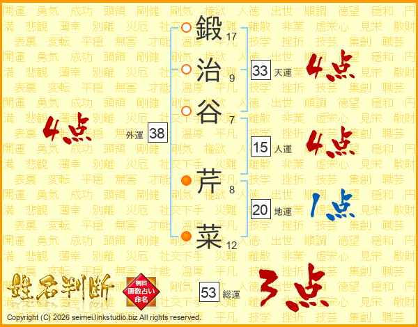 鍛治谷芹菜さんの外運は38画の4点!