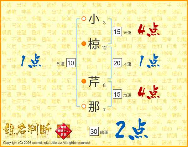 小(3画)椋(12画) 芹(8画)那(7画)