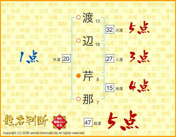 渡(13画)辺(19画) 芹(8画)那(7画)