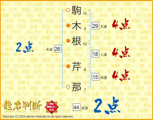 駒木根芹那さんの総運は44画の2点!