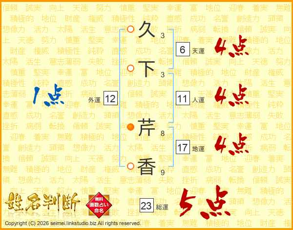 生活面を象徴する運勢です。外部から受ける影響力を表し、結婚運、家庭運や職場、環境への順応性を表します。総運から人運を引いた画数。姓や名が1文字の場合を除く。