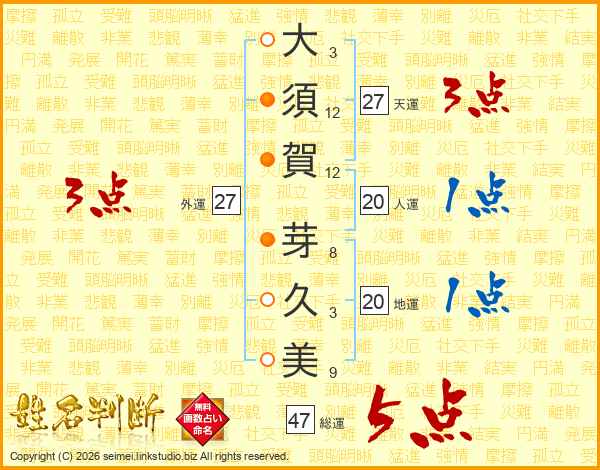 大(3画)須(12画)賀(12画) 芽(8画)久(3画)美(9画)