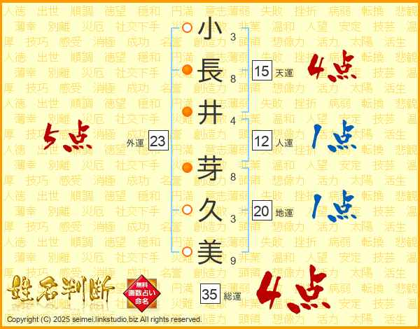 小(3画)長(8画)井(4画) 芽(8画)久(3画)美(9画)