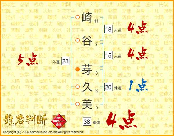 崎(11画)谷(7画) 芽(8画)久(3画)美(9画)