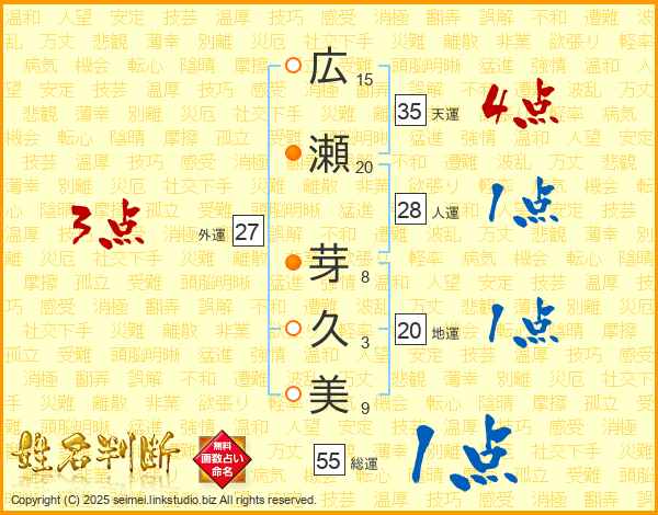 広(15画)瀬(20画) 芽(8画)久(3画)美(9画)