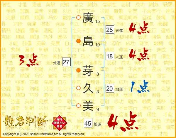 廣(15画)島(10画) 芽(8画)久(3画)美(9画)