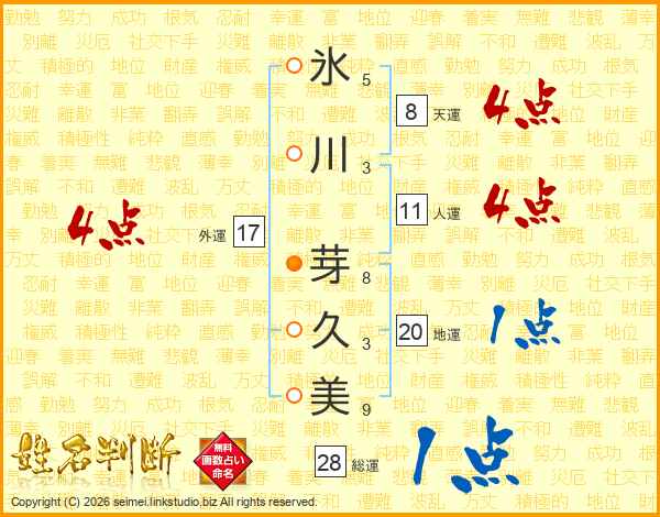 氷(5画)川(3画) 芽(8画)久(3画)美(9画)