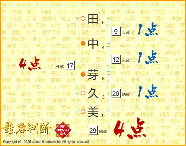 田(5画)中(4画) 芽(8画)久(3画)美(9画)
