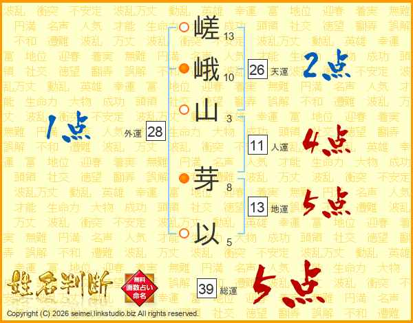 嵯(13画)峨(10画)山(3画) 芽(8画)以(5画)