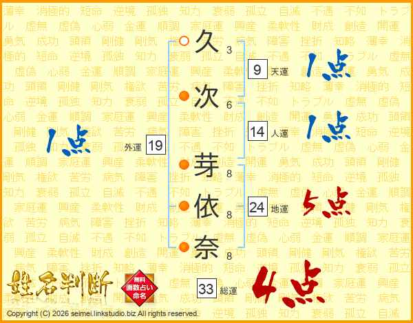 久(3画)次(6画) 芽(8画)依(8画)奈(8画)