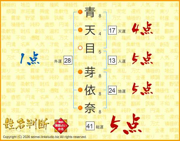青(8画)天(4画)目(5画) 芽(8画)依(8画)奈(8画)