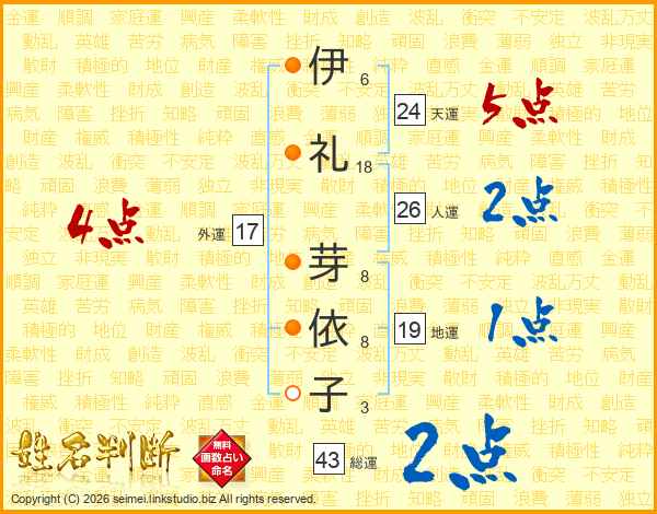 伊(6画)礼(18画) 芽(8画)依(8画)子(3画)