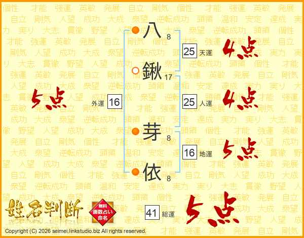 八(8画)鍬(17画) 芽(8画)依(8画)