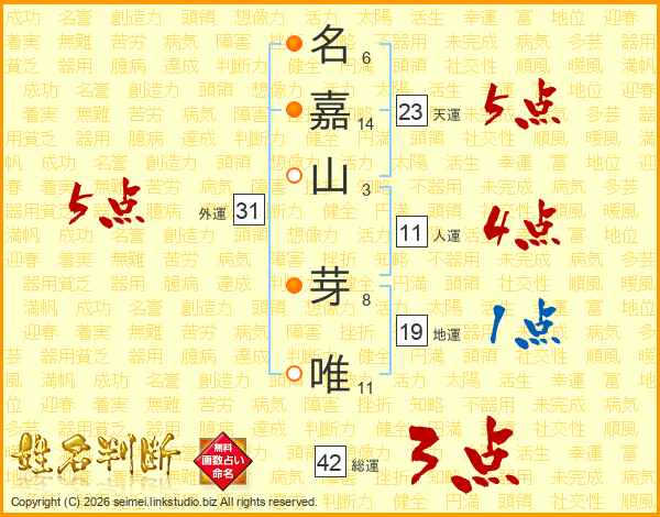 名(6画)嘉(14画)山(3画) 芽(8画)唯(11画)