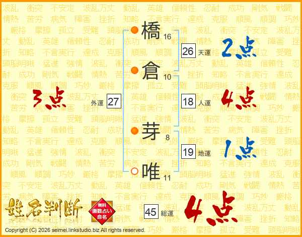 橋(16画)倉(10画) 芽(8画)唯(11画)