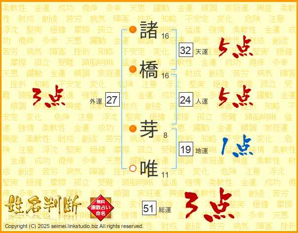 諸(16画)橋(16画) 芽(8画)唯(11画)