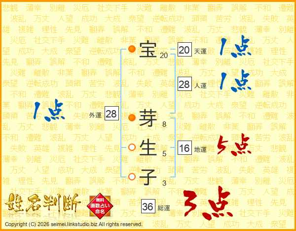 宝芽生子さんの総運は36画の3点!