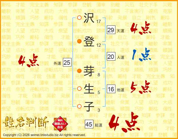 沢(17画)登(12画) 芽(8画)生(5画)子(3画)