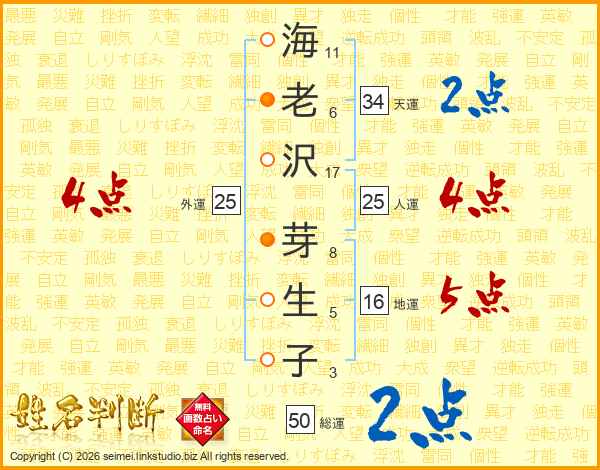 海(11画)老(6画)沢(17画) 芽(8画)生(5画)子(3画)