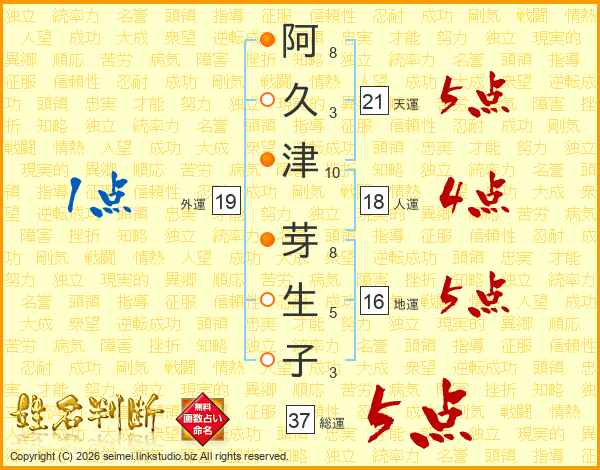 阿(8画)久(3画)津(10画) 芽(8画)生(5画)子(3画)