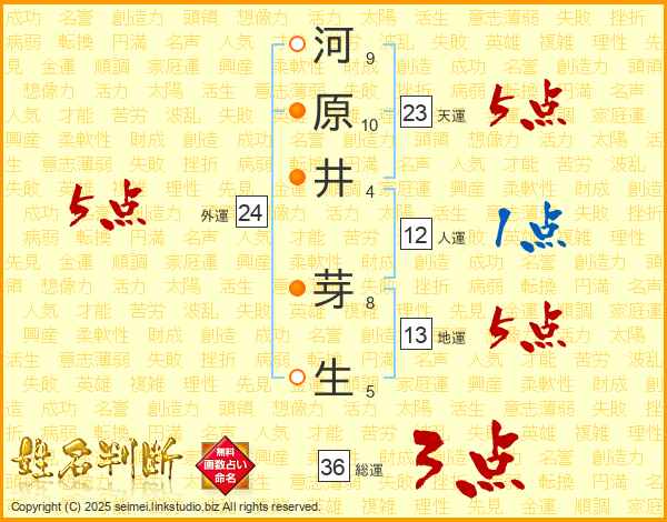 河(9画)原(10画)井(4画) 芽(8画)生(5画)