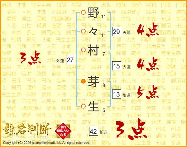 野(11画)々(11画)村(7画) 芽(8画)生(5画)