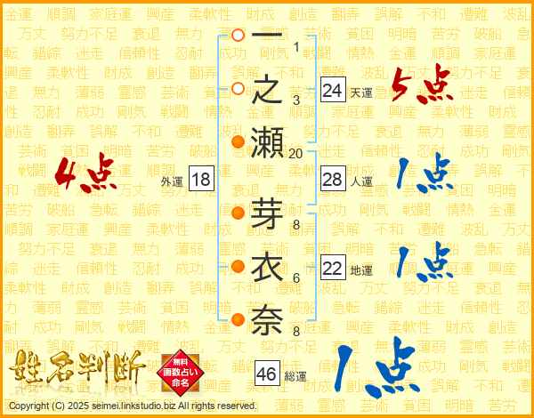 一之瀬芽衣奈さんの総運は46画の1点!