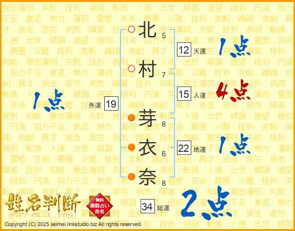 北(5画)村(7画) 芽(8画)衣(6画)奈(8画)