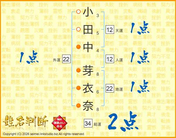 小(3画)田(5画)中(4画) 芽(8画)衣(6画)奈(8画)