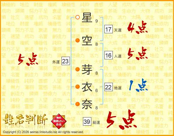 星(9画)空(8画) 芽(8画)衣(6画)奈(8画)