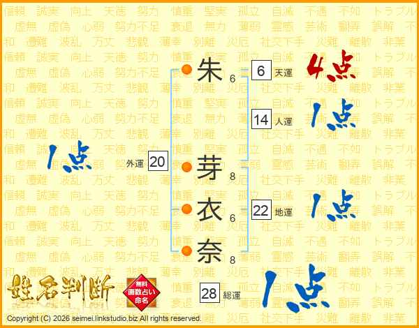 朱(6画) 芽(8画)衣(6画)奈(8画)
