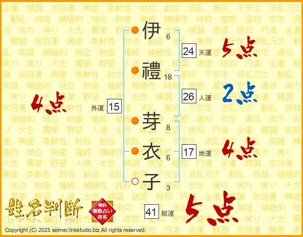 伊(6画)禮(18画) 芽(8画)衣(6画)子(3画)