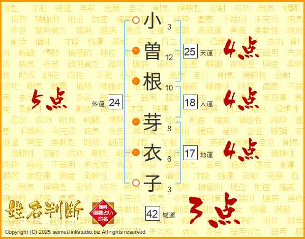 小(3画)曽(12画)根(10画) 芽(8画)衣(6画)子(3画)