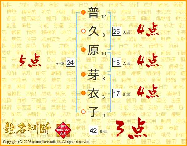 普(12画)久(3画)原(10画) 芽(8画)衣(6画)子(3画)