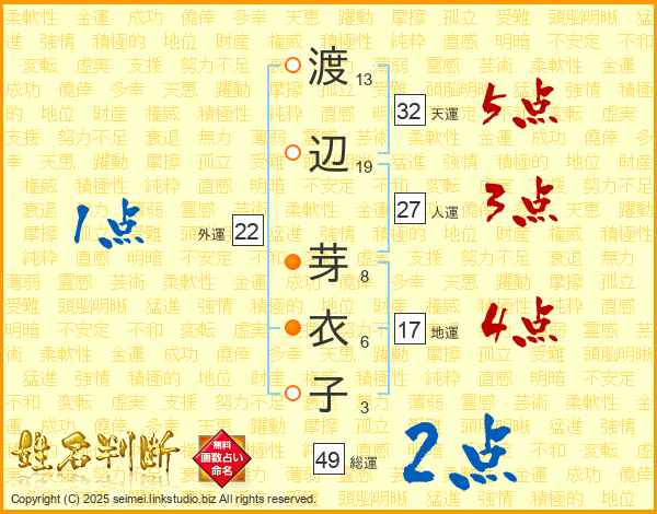 渡(13画)辺(19画) 芽(8画)衣(6画)子(3画)