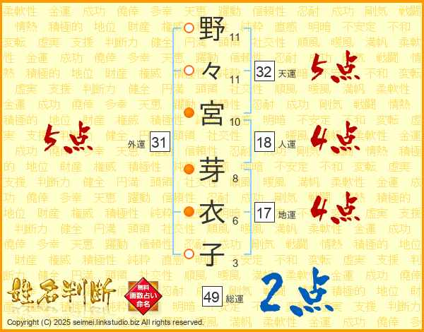 野(11画)々(11画)宮(10画) 芽(8画)衣(6画)子(3画)