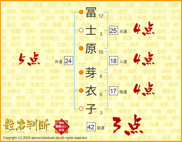 冨(12画)士(3画)原(10画) 芽(8画)衣(6画)子(3画)