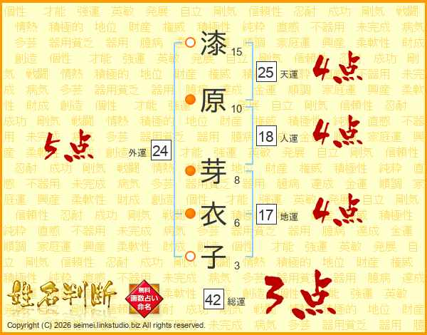 漆(15画)原(10画) 芽(8画)衣(6画)子(3画)