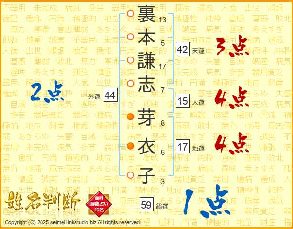 裏(13画)本(5画)謙(17画)志(7画) 芽(8画)衣(6画)子(3画)