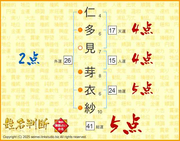 仁(4画)多(6画)見(7画) 芽(8画)衣(6画)紗(10画)