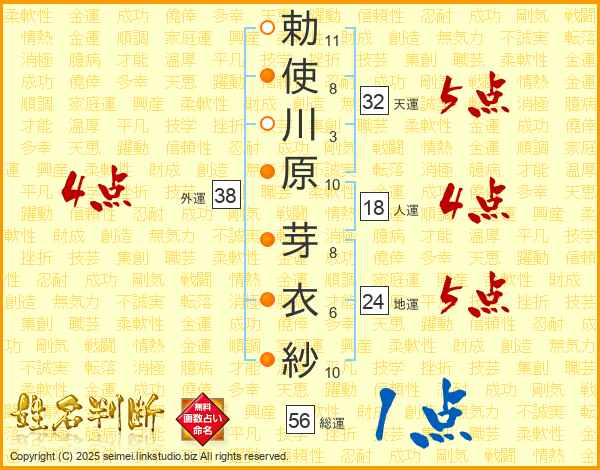 勅(11画)使(8画)川(3画)原(10画) 芽(8画)衣(6画)紗(10画)