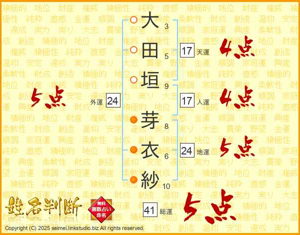 大(3画)田(5画)垣(9画) 芽(8画)衣(6画)紗(10画)