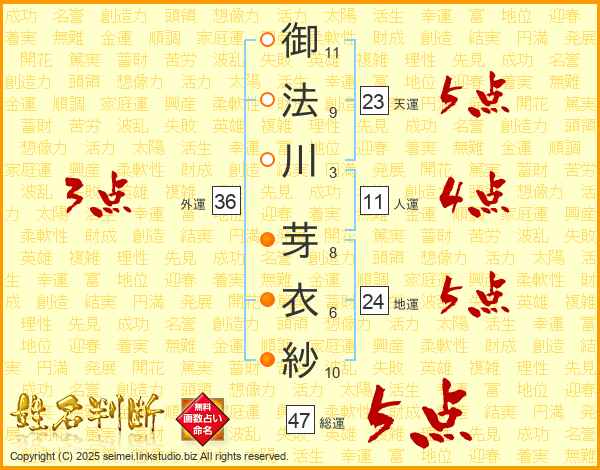 御(11画)法(9画)川(3画) 芽(8画)衣(6画)紗(10画)