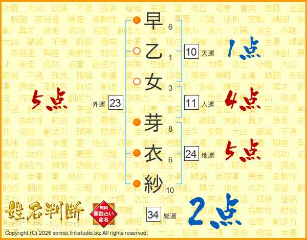 早(6画)乙(1画)女(3画) 芽(8画)衣(6画)紗(10画)