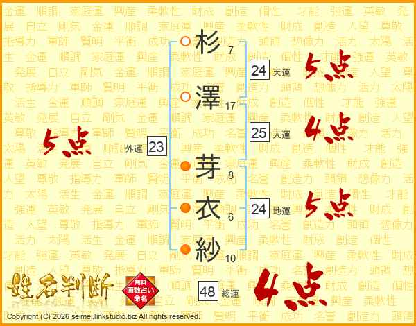 杉澤芽衣紗さんの総運は48画の4点!