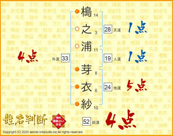槝(14画)之(3画)浦(11画) 芽(8画)衣(6画)紗(10画)