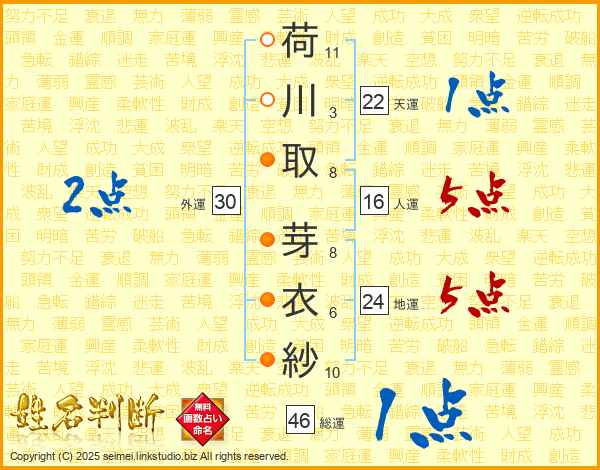 荷(11画)川(3画)取(8画) 芽(8画)衣(6画)紗(10画)