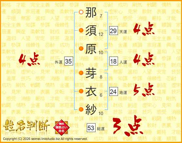 那(7画)須(12画)原(10画) 芽(8画)衣(6画)紗(10画)