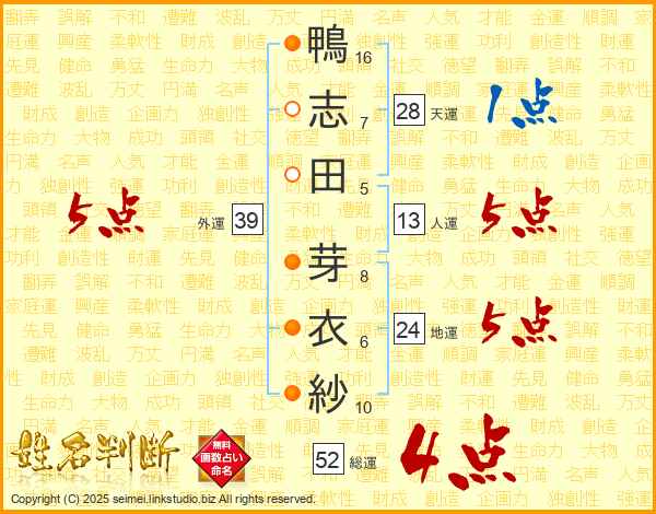鴨(16画)志(7画)田(5画) 芽(8画)衣(6画)紗(10画)